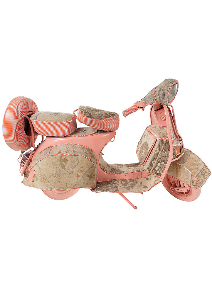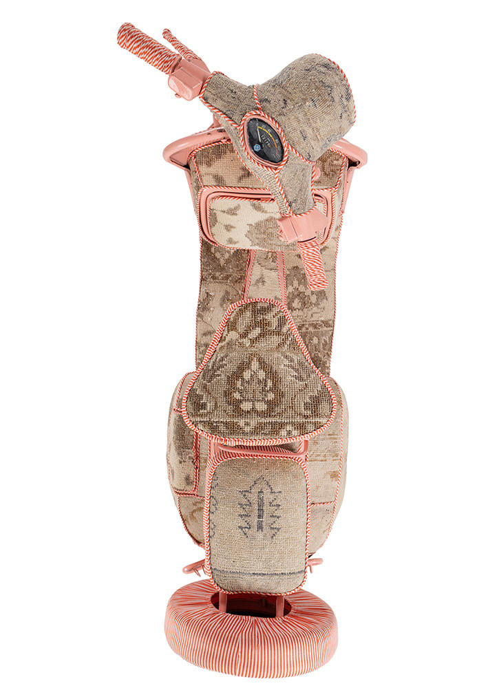 The Memoir on Wheels is a metaphoric representation of the first ride many entrepreneurs relied on during the retro era. Beautifully wrapped in vibrant, woven rugs, it stands as an art installation, evoking nostalgia for a time when ambition and style met on the open road. This display piece captures the spirit of entrepreneurship, honoring the past while inspiring future generations with its timeless design and artistic charm.