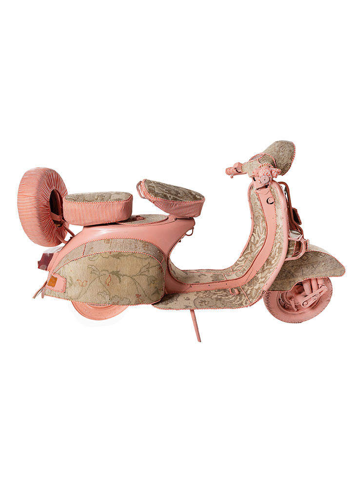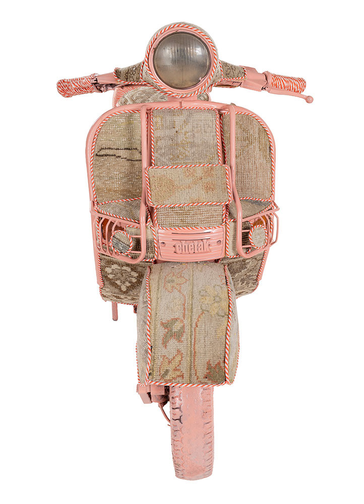 The Memoir on Wheels is a metaphoric representation of the first ride many entrepreneurs relied on during the retro era. Beautifully wrapped in vibrant, woven rugs, it stands as an art installation, evoking nostalgia for a time when ambition and style met on the open road. This display piece captures the spirit of entrepreneurship, honoring the past while inspiring future generations with its timeless design and artistic charm.