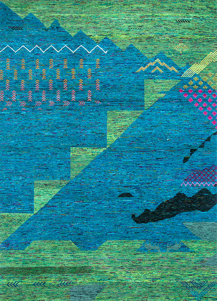 BAANDHOur weaver, Surji named this carpet “Baandh” referring to a gravity water dam and its surroundings that have weaved into this carpet. Suji shares a story about ‘Baandh’ as one of her daughters always loves a place filled up with water and the sound of waves and cherishes the number of cold waves that pass from one to another. Therefore, Surji has woven her daughter’s through-process onto this carpet which connects with water in the middle of the rug and covers its surroundings with colorful motifs from side to side that give it a unique look.