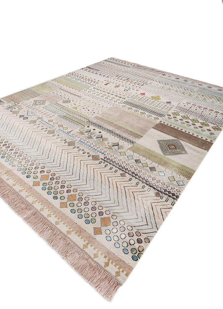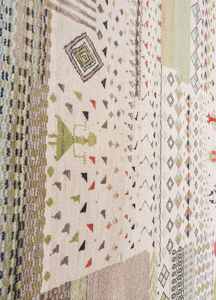 GujariyaDurga and Sumitra, the mother-daughter duo, weave side by side, but they rarely plan together. Each follows her own thoughts, letting ideas appear as they come. Durga Devi has been weaving for nearly fifteen years; Sumitra learned the craft from her mother. Their styles are different, yet they sit in an easy rhythm. In this rug, the two of them created a scattered world of motifs — a line of ‘shakkarpara,’ (Indian sweet snack), round ‘laddoos’, a unique tree, and many small patterns they tried on the spot. They enjoy experimenting, and the rug carries that playful energy. What ties the piece together are the three “Gujariya” they wove, inspired by a saree they once saw, where three “milkmaids” were printed in a row. That image stayed with them, and it eventually became the name of the rug. They also added three matkas, keeping the theme alive. The result is a free-flowing Manchaha filled with their curiosity, their memories, and their constant urge to try something new.