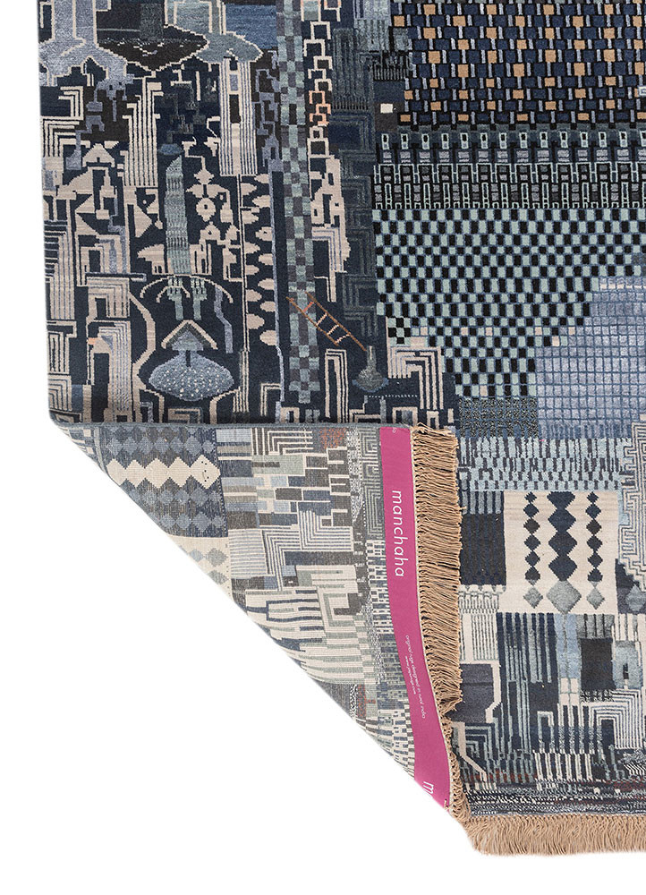 Bhool Bhoolaiya"Bhool Bhoolaiya" (Maze) is a treasure trove of memories, crafted by the mother-daughter duo, Koyali and Meenu. Known for their different styles, they usually balance each other in their creations. At first, they were unsure of what to weave. Sitting together, they began talking about their childhood and the games they once played. Slowly, the rug turned into a playground for both of them. Meenu brought in her love for Tetris. But instead of plain blocks, she wove different modern elements that fit into each other. She remembered how she loved the Find the Difference game, so she placed motifs like the ladder and chessboard in a way that viewers would have to search for them. On the right side, Koyali wove her own playground, which was the earth itself. She smiled as she said that children today only play on phones, while her own childhood was spent outdoors, hands full of mud and sand. She wove the patterns she once drew on the ground, a simple joy that now sits in contrast with Meenu’s modern forms. She also added triangles that connect to each other, inspired by a jigsaw puzzle she used to play. When the rug was complete, both of them looked at it with pride. Two different childhoods had come together, woven into one hand-knotted memory. This rug became a full-circle moment for them, as it was the last Manchaha they wove together before Meenu’s marriage. A beautiful coincidence to bring childhood alive in their last rug together.