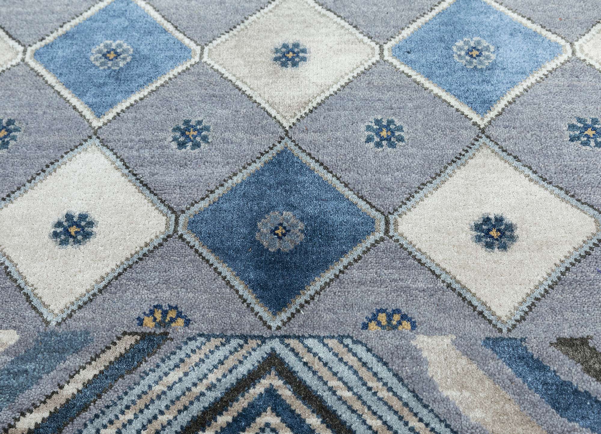 Neela galichaLeading a simple life in the village, Lada’s dream is to someday own the biggest diamond in the world. Undeterred by reality, she lives her fancy on her first Manchaha design. She weaved hundreds of diamonds, of different shapes, different sizes and colors. She likes blue color, and has used it the most in her rug. When the rug was half completed, she got ill and had to stop working for a few days. When she started again, her mind had changed. She completed the rug with a big multi colored diamond towards the lower part surrounded by abstract design patterns. She calls it “Neela galicha”(blue carpet), as in the end, she feels that her love for blue color was the only constant throughout the rug.