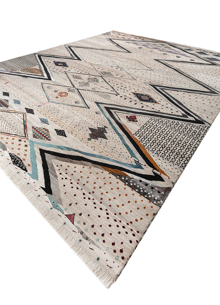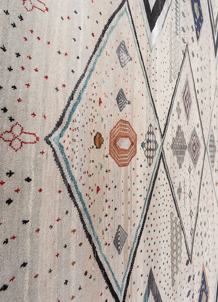 NavratnaThis extraordinary piece of art was brought to life by 18 hands and the creative brilliance of nine Manchaha artists. "Navratna" is truly one of its kind. At first glance, you would never guess how many artisans worked on it as the design flows so seamlessly that it reflects the perfect harmony shared on one loom. The weavers who began the chevron zig-zag pattern left the loom at different times, yet those who followed continued the design effortlessly. No one instructed them to do so; they did it out of respect for the artists before them, adding their own creative touches while honouring the original vision. To the artisans, this rug is a jewel crafted by nine precious creators, hence the name “Navratna” (nine gems).
