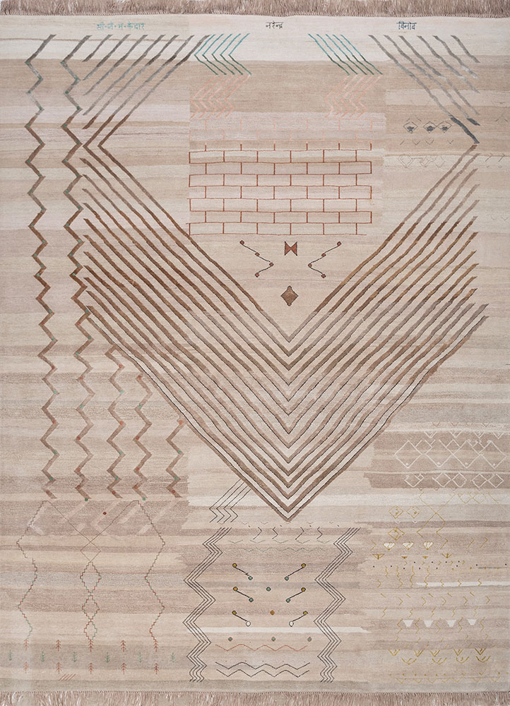 Deesha ka GyanSoni, Narendra, and Vinod crafted their final Manchaha piece with a heartfelt message that resonates deeply with the weavers. Titled “Deesha ka Gyan,” which translates to “The Knowledge of the Direction,” it emphasizes the importance of pausing long enough to determine your next step. The striking, chevron-like lines in the center draw your gaze downward while simultaneously anchoring you in place, as if you are standing at a crossroads. The weavers have incorporated sharp, straight, hazy, and zig-zag paths that represent the various choices life presents. The upper section exudes a sense of quiet energy, with jagged lines converging inward and a brick wall at the center. Two arrows point in opposite directions, resembling a compass. Through these intricate motifs, the weavers convey that while life offers multiple paths, it is essential to take a moment, refrain from hasty decisions, and select the right direction.
