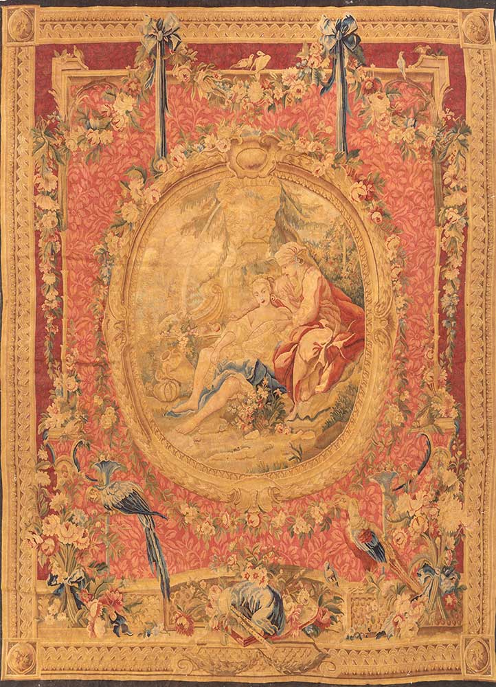 From France, around 1850, comes this modest 6'6" x 8'6" Aubusson antique tapestry. It highlights a main oval picture where figures are portrayed in golden shades. This picture rests on a red background that's full of charming flowers, ribbons, and intricate patterns. Below, illustrations of birds and plants add to the scenery. A broad, golden border neatly wraps around the entire design.