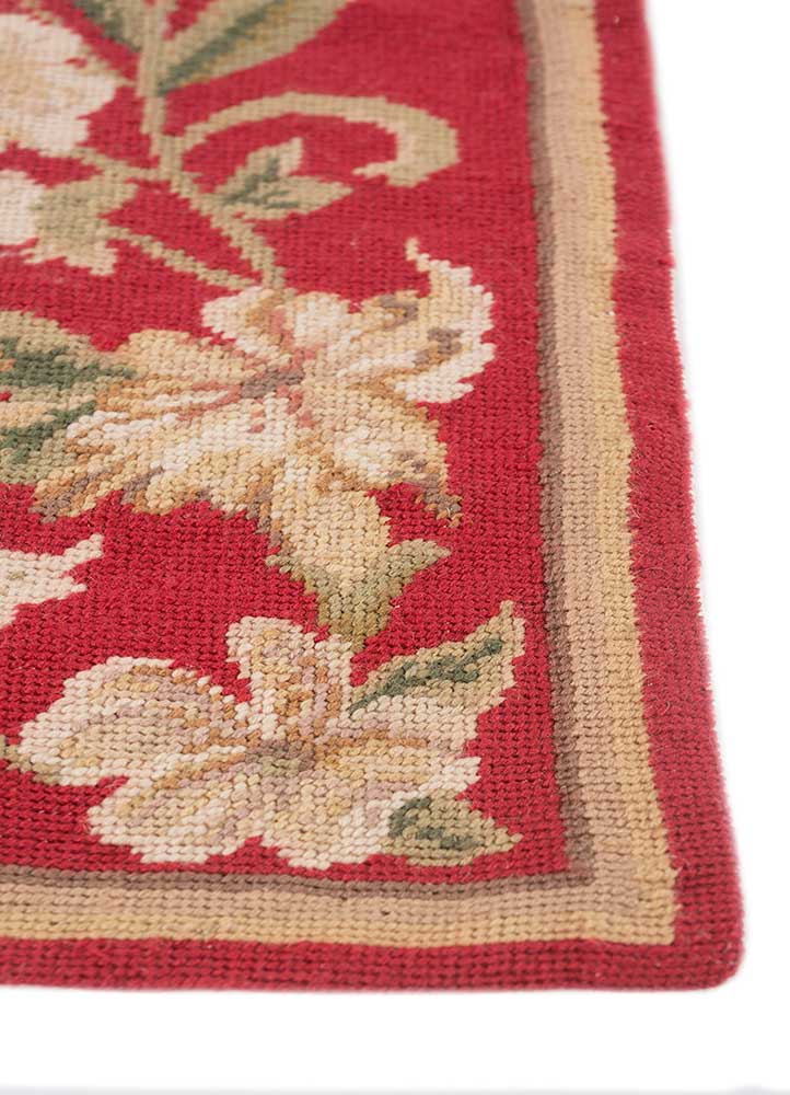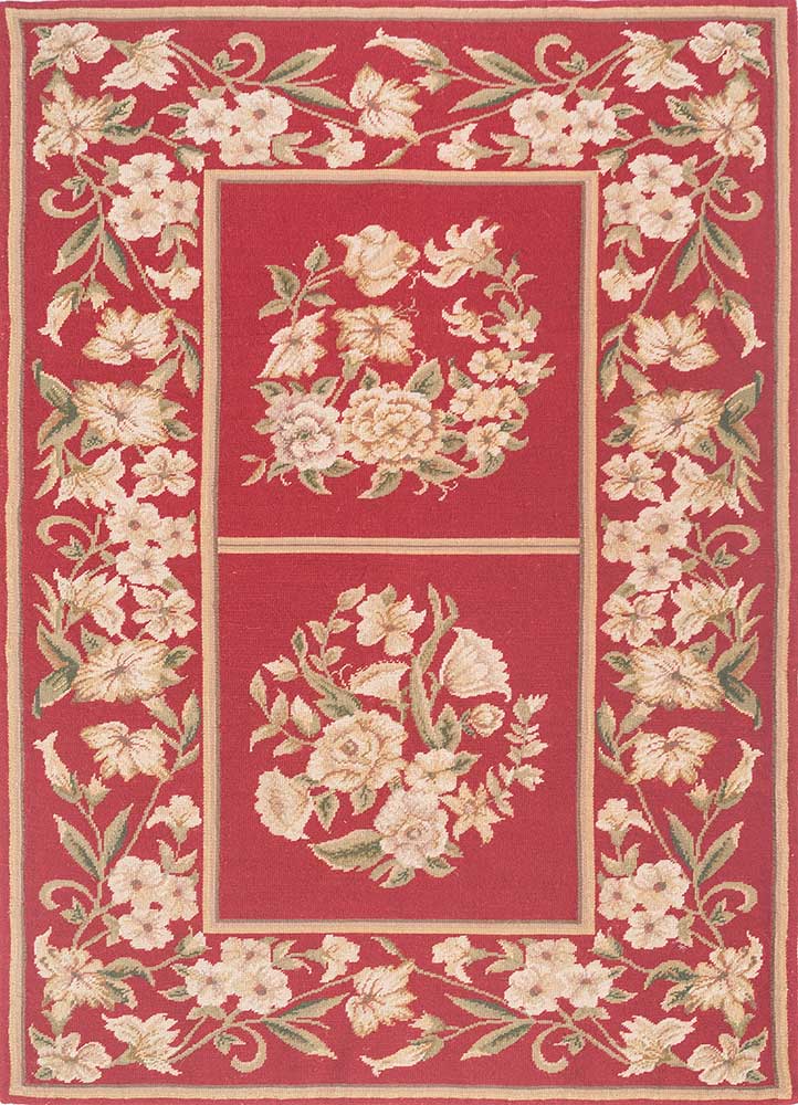 China, circa 2000 —Measuring approximately 3 x 5 ft., this Chinese rug draws inspiration from classical French design traditions, reinterpreted with a vibrant contemporary palette. The field, rendered in a bold Ribbon Red, is symmetrically divided to feature two grand floral bouquets composed of stylized blossoms and foliate elements in a soft Wasabi tone. A wide border encloses the composition, adorned with a continuous scrolling vine and delicate blossoms in matching hues, creating a harmonious visual frame. The juxtaposition of saturated color and restrained ornamentation reflects the skilled hand of late 20th-century Chinese artisans catering to a global decorative market.