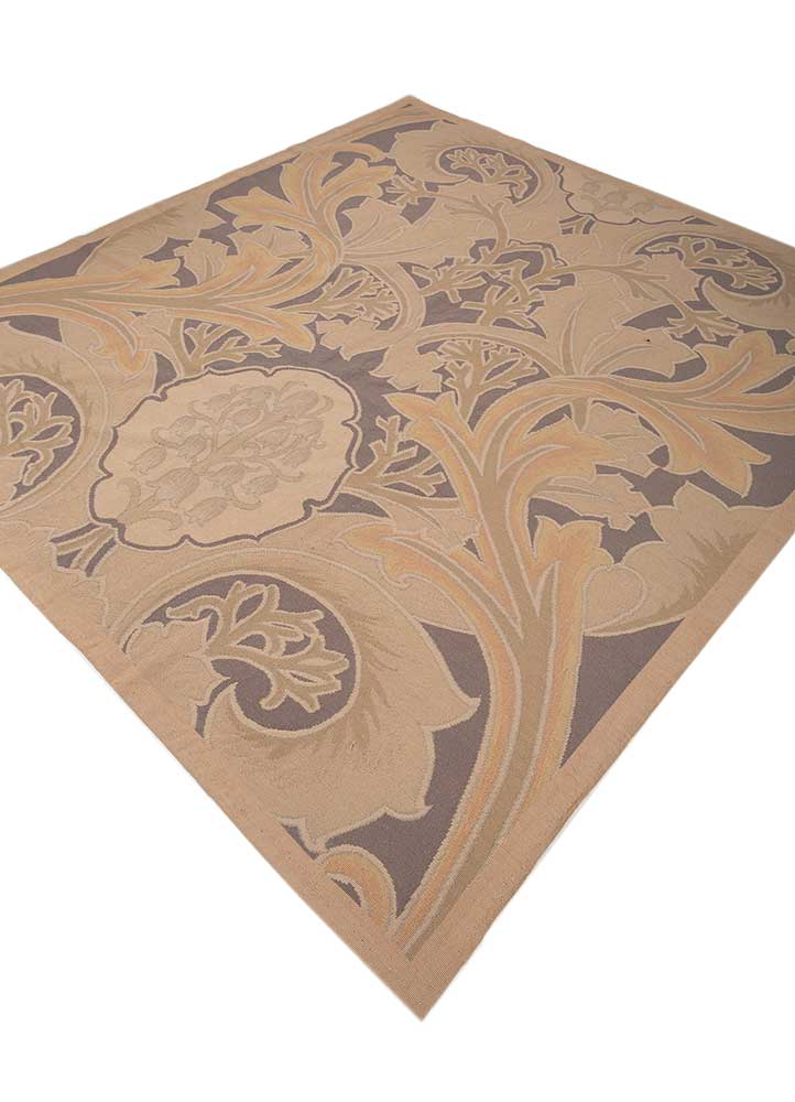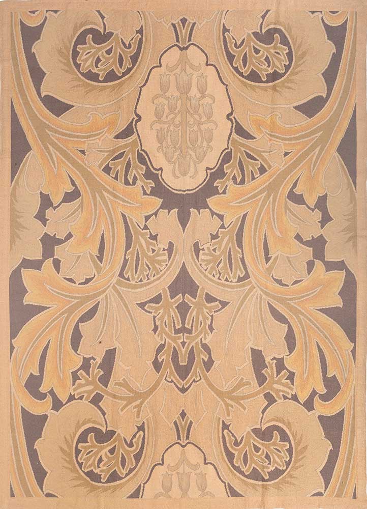 The field of this Chinese rug, dating from circa 1990, is soft Ochre and deep Pale Aubergine. This forms a grand-scale, all-over pattern of scrolling acanthus leaves and highly stylized floral elements. A distinctive cartouche-like element near the top introduces a nuanced variation. A proportioned, monochromatic border frames the composition, echoing the sophisticated field palette.