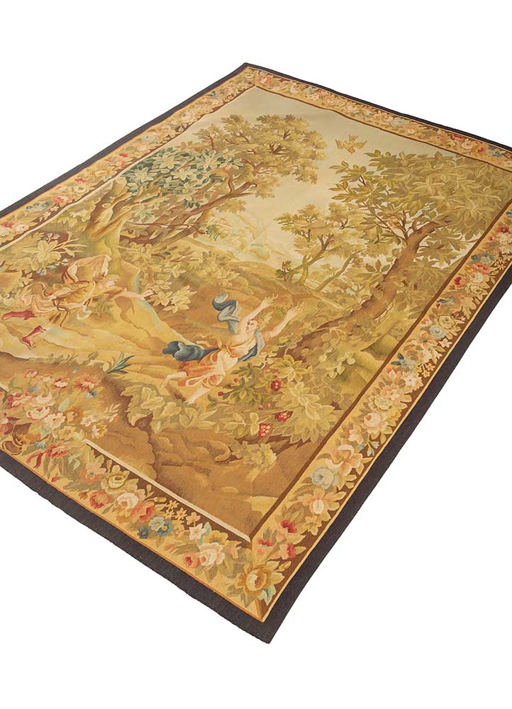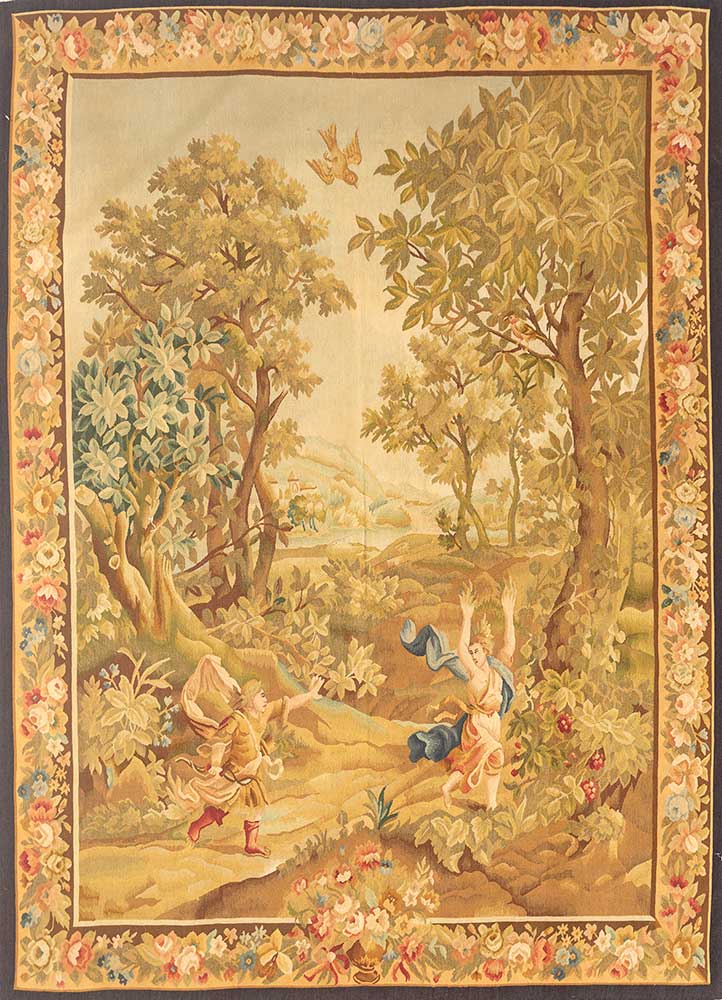 Circa 1920, this charming antique French tapestry presents a serene landscape scene, rendered in a palette of delicate 'sage green' and 'natural brown' tones. The verdant composition depicts figures engaging in a pastoral narrative are gracefully woven into the foreground, their forms harmonizing with the natural surroundings. This piece embodies the refined aesthetic of French decorative arts, offering a timeless evocation of bucolic beauty.
