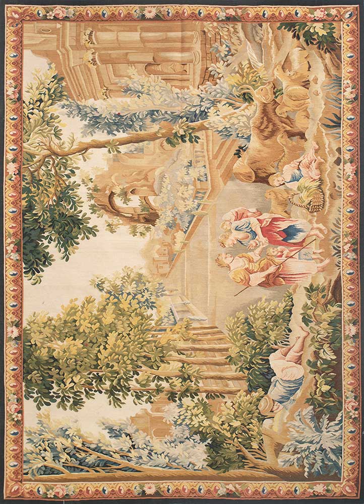 This 1990 Chinese rug measures 5 by 7 feet and shows the skill of Renaissance art. It is woven in warm Indian brown and dark brown colors. The rug depicts a herding scene from the ancient West with great detail. The natural elements look lifelike, and the buildings appear grand. The people in the scene show real emotion. A pretty floral border surrounds the whole design. This beautiful rug brings the charm of the past into any space.