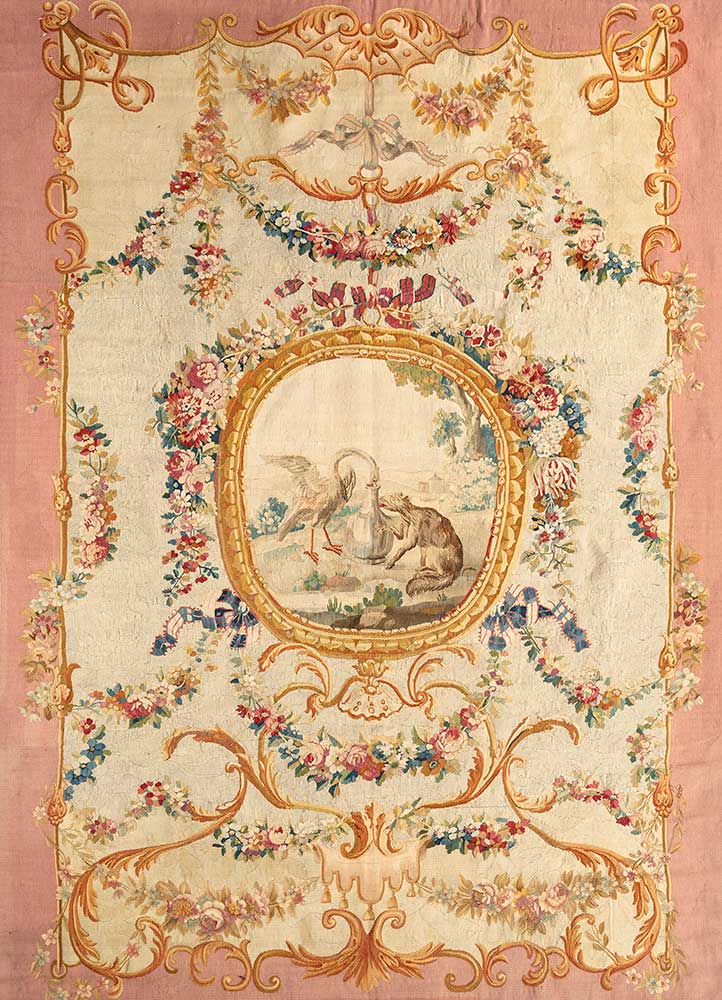 An Antique French Aubusson ‘Fable’ Tapestry, Circa 1780 Size approximately 6 ft. by 9 ft. This finely woven Aubusson tapestry, circa 1780, presents a charming ‘Fable’ design, reflecting the period’s taste for allegorical narrative. The composition centers on an oval medallion enclosing a pastoral scene, likely drawn from popular folklore, set against a light ground that enhances the delicacy of the imagery. The refined palette combines soft tones of Light Coral in the floral garlands with rich Dark Amber Gold outlining the oval frame, acanthus scrolls, and swags. Graceful bouquets, blossoms, and ribbon-tied garlands enrich the field, their arrangement lending a romantic elegance. The border continues this theme with scrolling floral ornamentation in golden tones with touches of coral, harmoniously framing the central vignette.